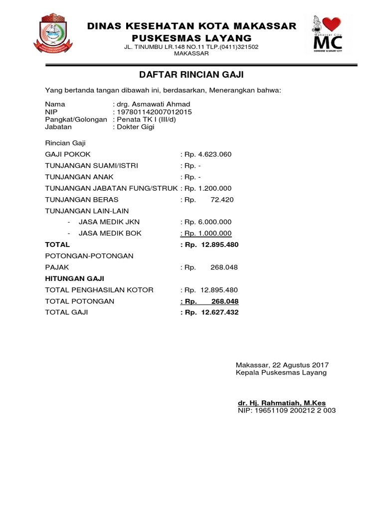 Menurut R salah satu dari empat orang bidan mengatakan sebelum mereka bekerja Kepala Puskesmas menjanjikan memberi gaji kepada mereka sebesar Rp1 juta per bulan. Gaji Bidan Bekerja menjadi tenaga medis seperti dokter PERAWAT atau bahkan bidan mungkin menjadi suatu keinginan bagi sebagian orang. Saya tidak mau ada masalah memang gaji belum masuk kata bidan ini. Maksudnya pada slip gaji dijelaskan rincian penghasilan dan potongan.