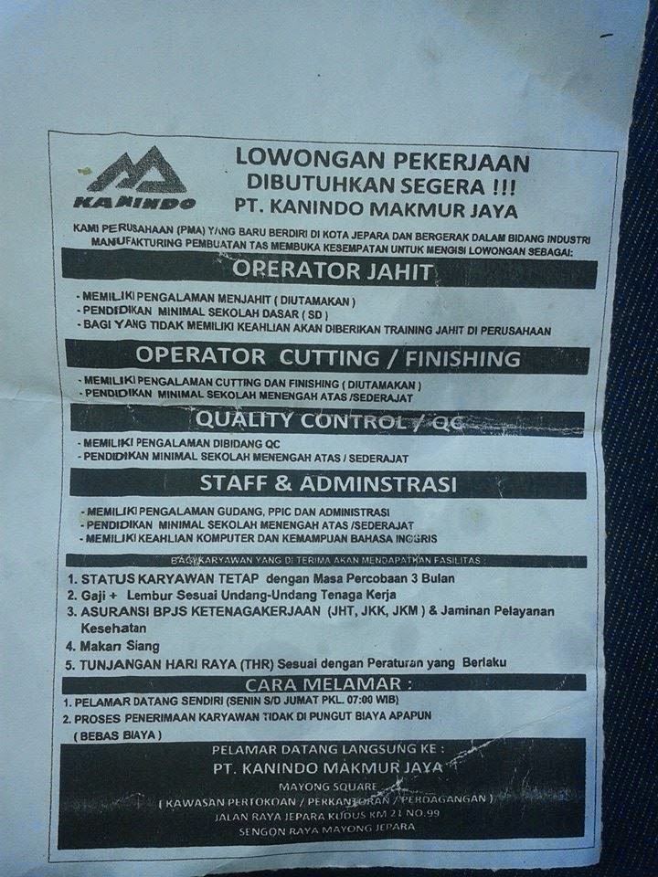 Menyiapkan marker sesuai style dan jenis bahan yang akan digelar 2. Jepara Regency Central Java Indonesia. Kanindo Makmur Jaya bagi member BLJ yang lagi bingung nyari kerjaan silahkan disimak informasi yang mimin berikan baik baik tentang Kriteria dan Persayaratan yang dibutuhkan. Lowongan kerja terbaru 2020 di PT Kanindo Makmur Jaya yang berlokasi di Jepara.